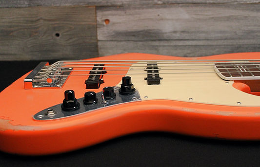 CONTROLS: volume, pan pot (pickup selector), treble boost/cut, mid boost/cut, bass boost/cut, active/passive toggle